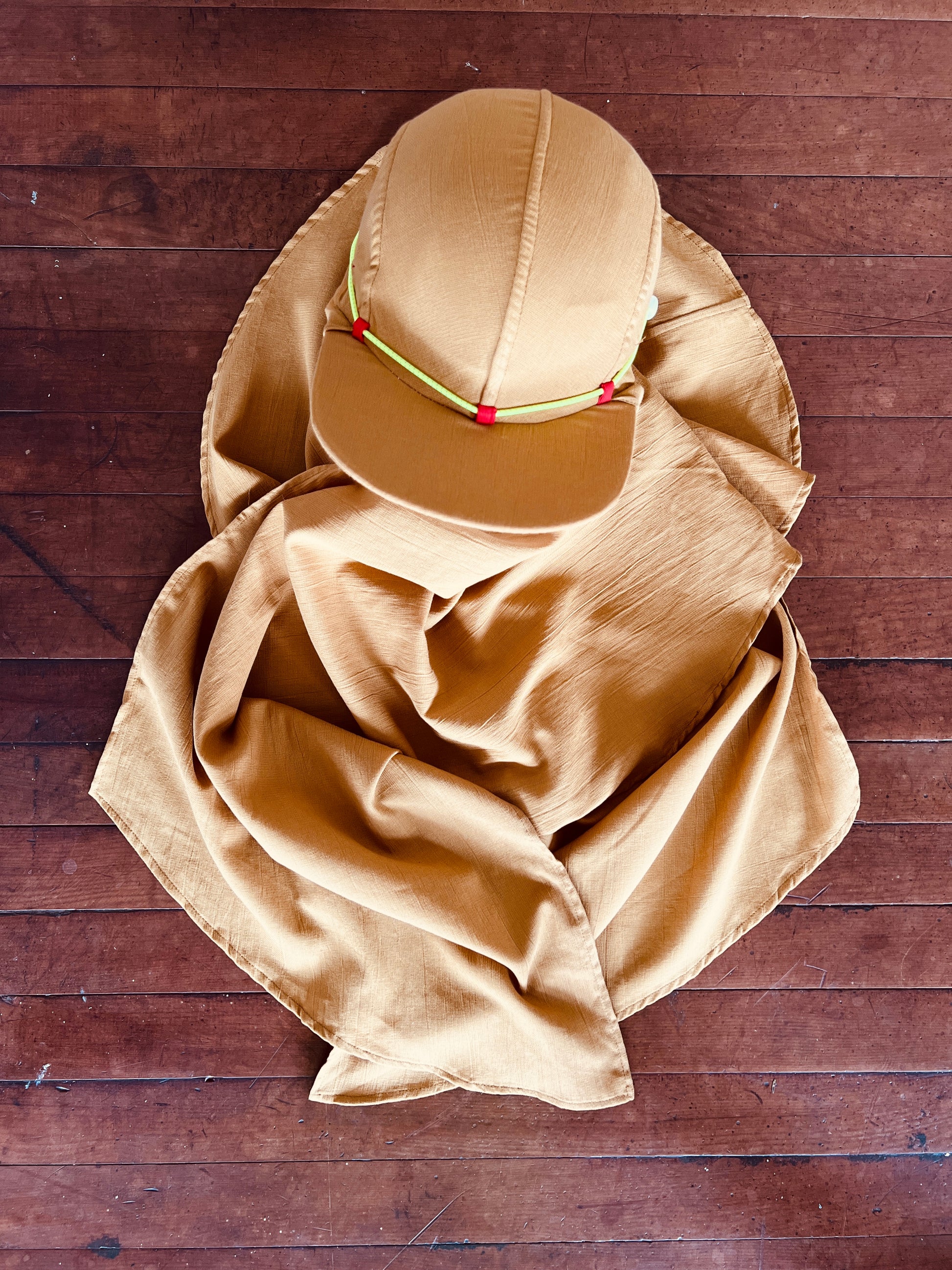 This headwear was designed to provide cover of your choosing, for sun, dust, or feel. Made from breathable natural fibres, the fabric of the hat can be draped as you need and held in place by elastic around the crown. The hats are one size, fits most. Cord elastic options can tie to create a more snug fit, if you wanted that. Price includes a JB tote bag, because we are all doing away with plastic and excess packaging, yes lawd.