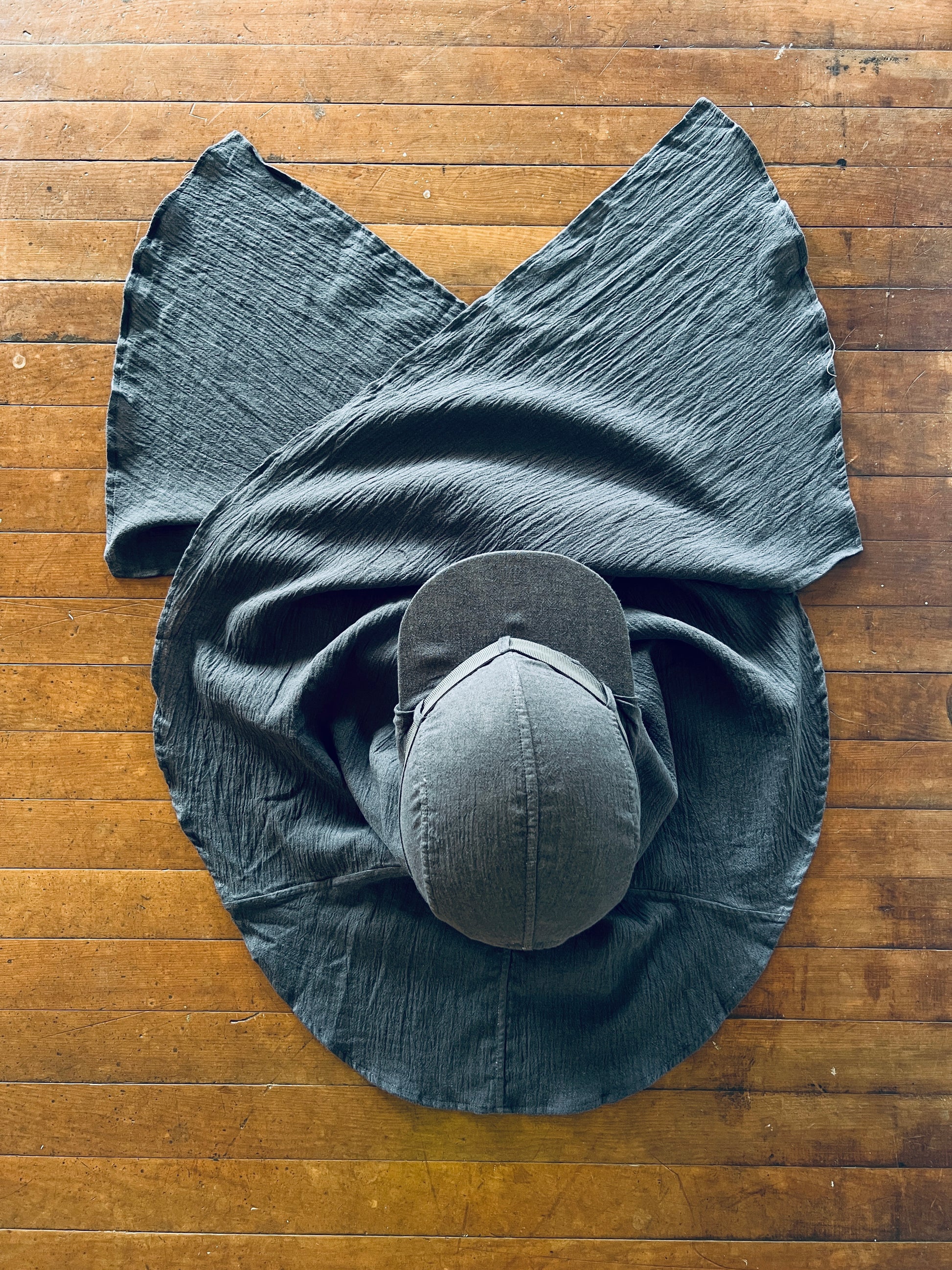 This headwear was designed to provide cover of your choosing, for sun, dust, or feel. Made from breathable natural fibres, the fabric of the hat can be draped as you need and held in place by elastic around the crown. The hats are one size, fits most. Cord elastic options can tie to create a more snug fit, if you wanted that. Price includes a JB tote bag, because we are all doing away with plastic and excess packaging, yes lawd.