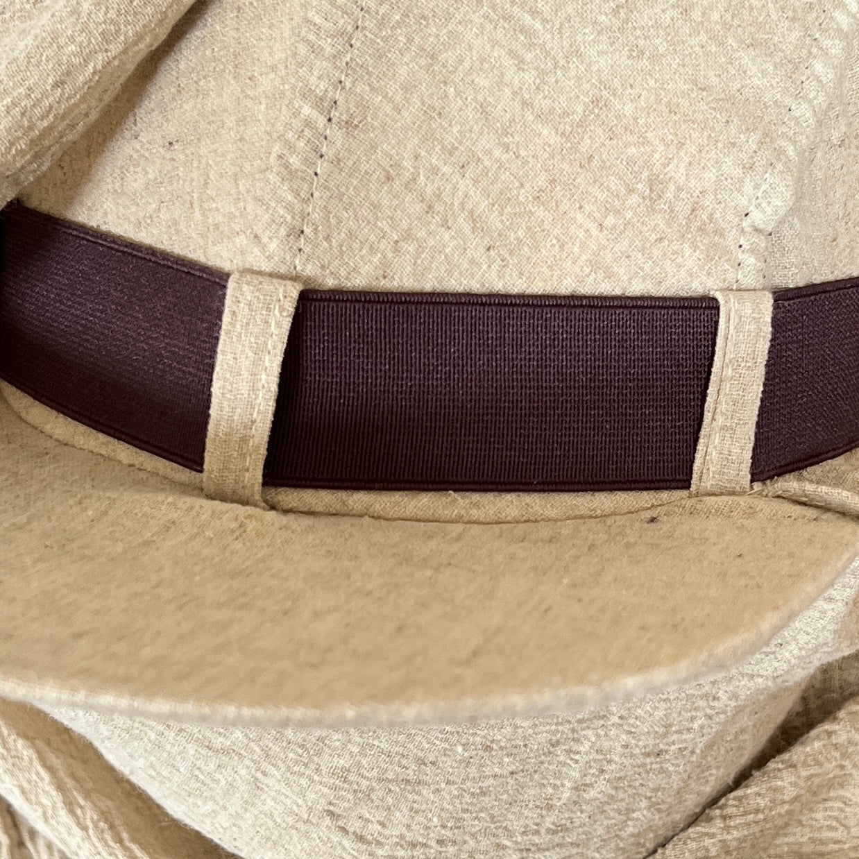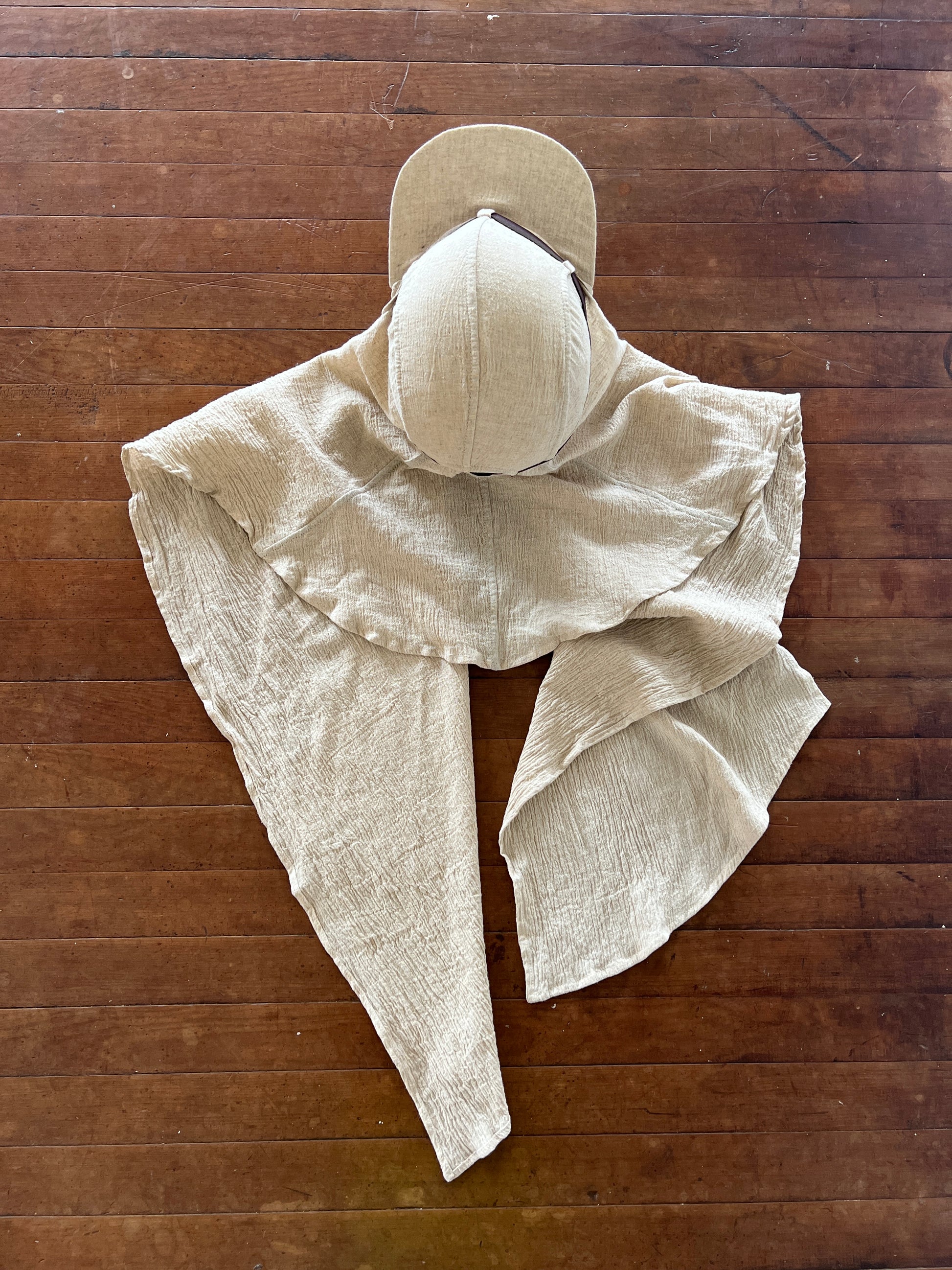 This headwear was designed to provide cover of your choosing, for sun, dust, or feel. Made from breathable natural fibres, the fabric of the hat can be draped as you need and held in place by elastic around the crown. The hats are one size, fits most. Cord elastic options can tie to create a more snug fit, if you wanted that. Price includes a JB tote bag, because we are all doing away with plastic and excess packaging, yes lawd.